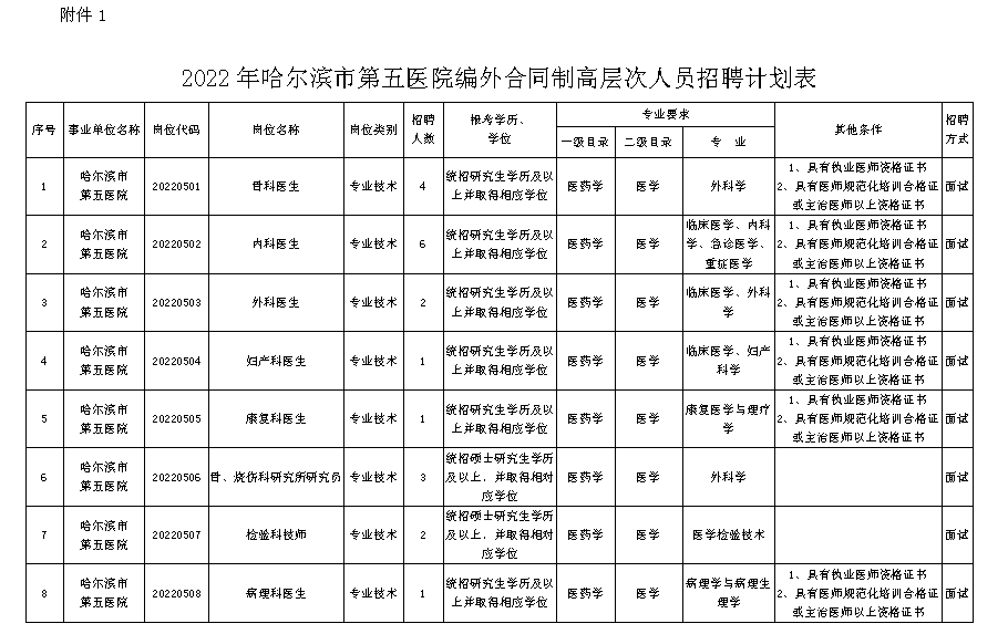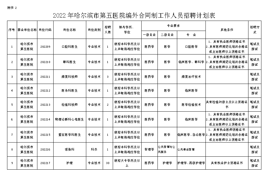 此次公開招聘編外合同制工作人員81人。具體招聘崗位、人數(shù)、條件等詳見《2022年12月哈爾濱市第五醫(yī)院公開招聘編外合同制工作人員計劃表》(以下簡稱《招聘計劃表》附件1、附件2)。