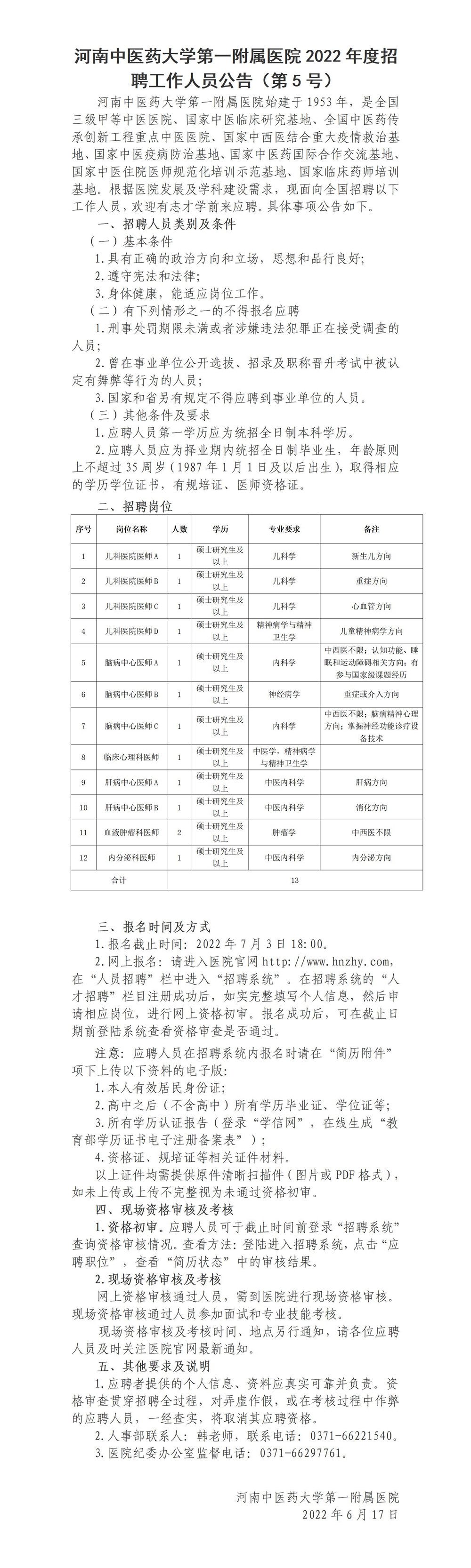 醫(yī)學教育網醫(yī)療衛(wèi)生招聘欄目每天都會更新全國各地新鮮招聘公告信息,致力于為廣大即將進入醫(yī)療衛(wèi)生系統(tǒng)/醫(yī)院/醫(yī)療事業(yè)單位的工作人員進行服務,以上就是醫(yī)學教育網小編為大家整理的:河南中醫(yī)藥大學第一附屬醫(yī)院2022年6月招聘工作人員13人,希望能夠幫助到大家。