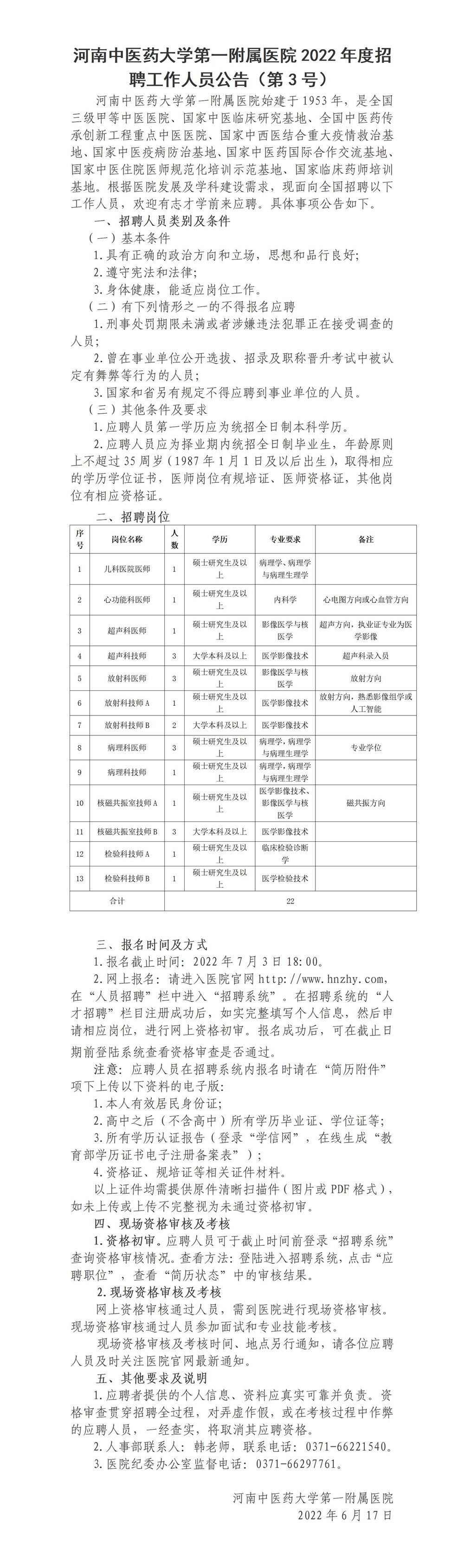 河南中醫(yī)藥大學(xué)第一附屬醫(yī)院2022年招聘工作人員22人