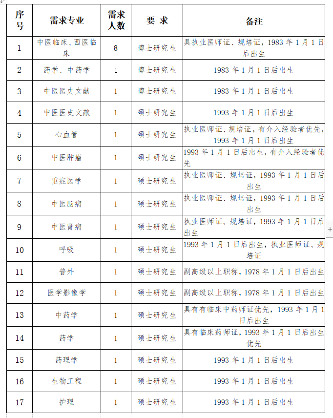 招聘專業(yè)技術(shù)崗位人員博士研究生10人,碩士研究生學(xué)歷14人。詳見附表1《河南省中西醫(yī)結(jié)合醫(yī)院2023年公開招聘人員一覽表》。
