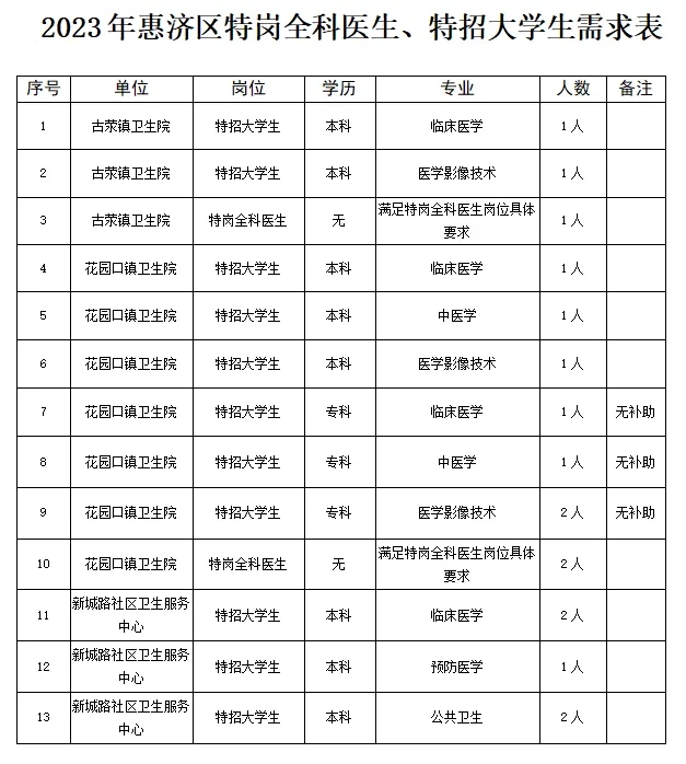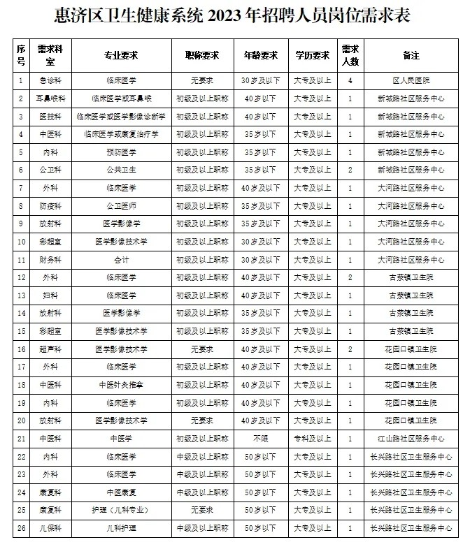 崗位、學(xué)歷、專業(yè)、職稱等資格條件見《2023年鄭州市惠濟區(qū)衛(wèi)生健康系統(tǒng)引進人才崗位需求表》(附件1)、《2023年惠濟區(qū)特崗全科醫(yī)生、特招大學(xué)生需求表》(附件2)。