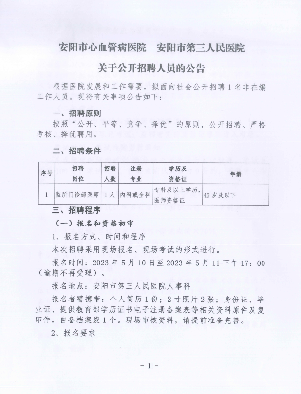 河南省安陽(yáng)市第三人民醫(yī)院招聘監(jiān)所門診部醫(yī)師1名