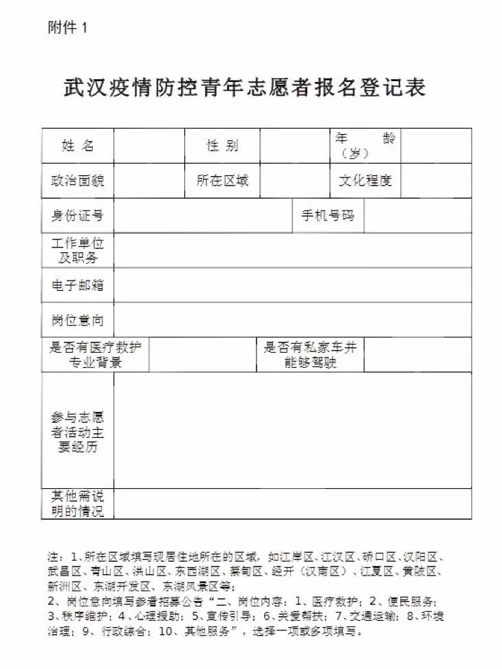 請(qǐng)符合條件并有意愿參加疫情防控志愿服務(wù)的人員填寫《武漢疫情防控青年志愿者報(bào)名登記表》(詳見附件1),并發(fā)送至相應(yīng)報(bào)名郵箱,郵箱地址詳見《武漢疫情防控青年志愿者招募聯(lián)系表》(附件2)。