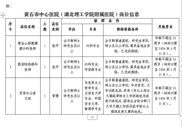 附件一:2024年度黃石市中心醫(yī)院(湖北理工學(xué)院附屬醫(yī)院)公開招聘崗位信息