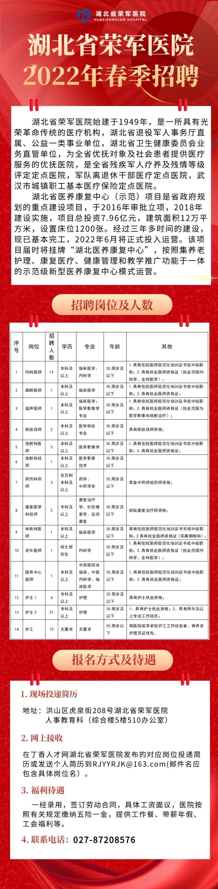 湖北省榮軍醫(yī)院2022年春季招聘工作人員71名