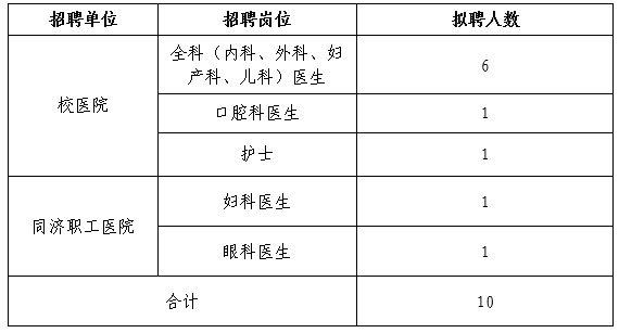非應(yīng)屆人員應(yīng)為統(tǒng)招本科及以上學(xué)歷,具有醫(yī)師資格證書或護(hù)士資格證,中級(jí)及以上專業(yè)技術(shù)職稱。中級(jí)職稱者不超過40周歲(1982年5月1日之后出生),高級(jí)職稱者不超過45周歲(1977年5月1日之后出生)。校醫(yī)院醫(yī)護(hù)崗位應(yīng)聘人員需4年以上三級(jí)醫(yī)院工作經(jīng)歷。同濟(jì)職工醫(yī)院有二級(jí)以上綜合性醫(yī)院5年工作經(jīng)驗(yàn)者優(yōu)先。