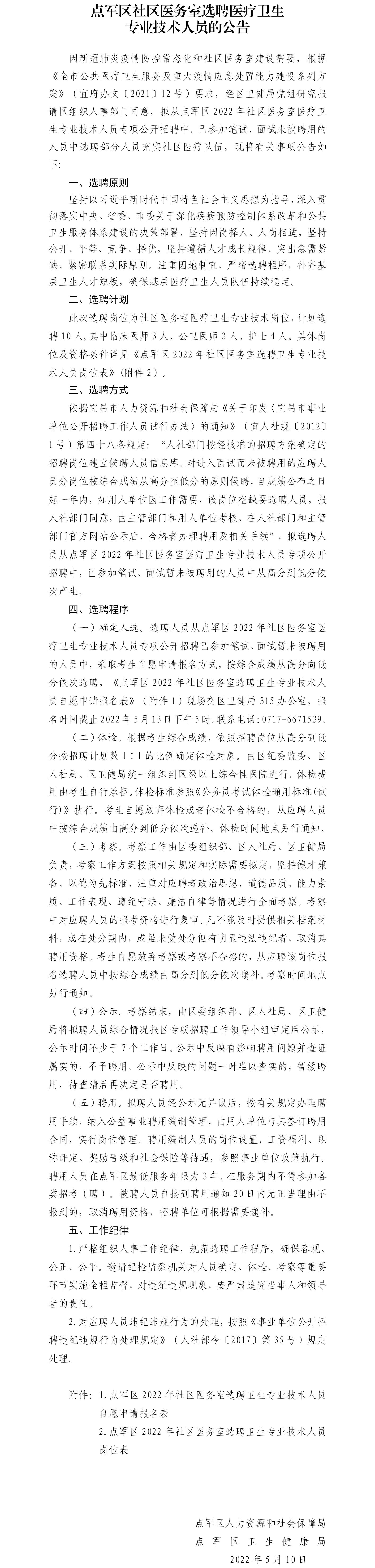 湖北省宜昌市點軍區(qū)社區(qū)醫(yī)務室選聘醫(yī)療衛(wèi)生專業(yè)技術人員10人