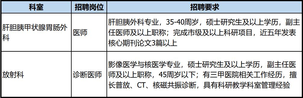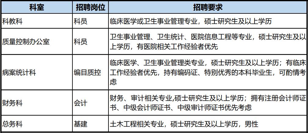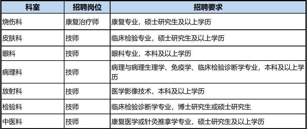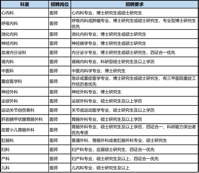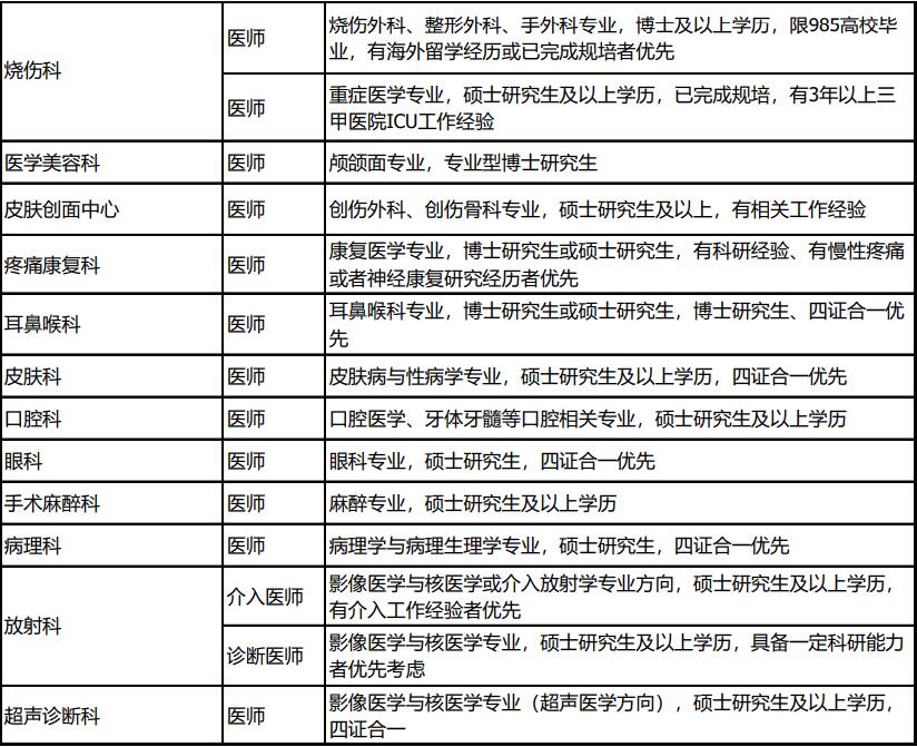 4.優(yōu)先錄用博士、具備三甲醫(yī)院相關(guān)工作經(jīng)歷者,臨床8年制博士可不受專業(yè)限制,應(yīng)聘各科室。