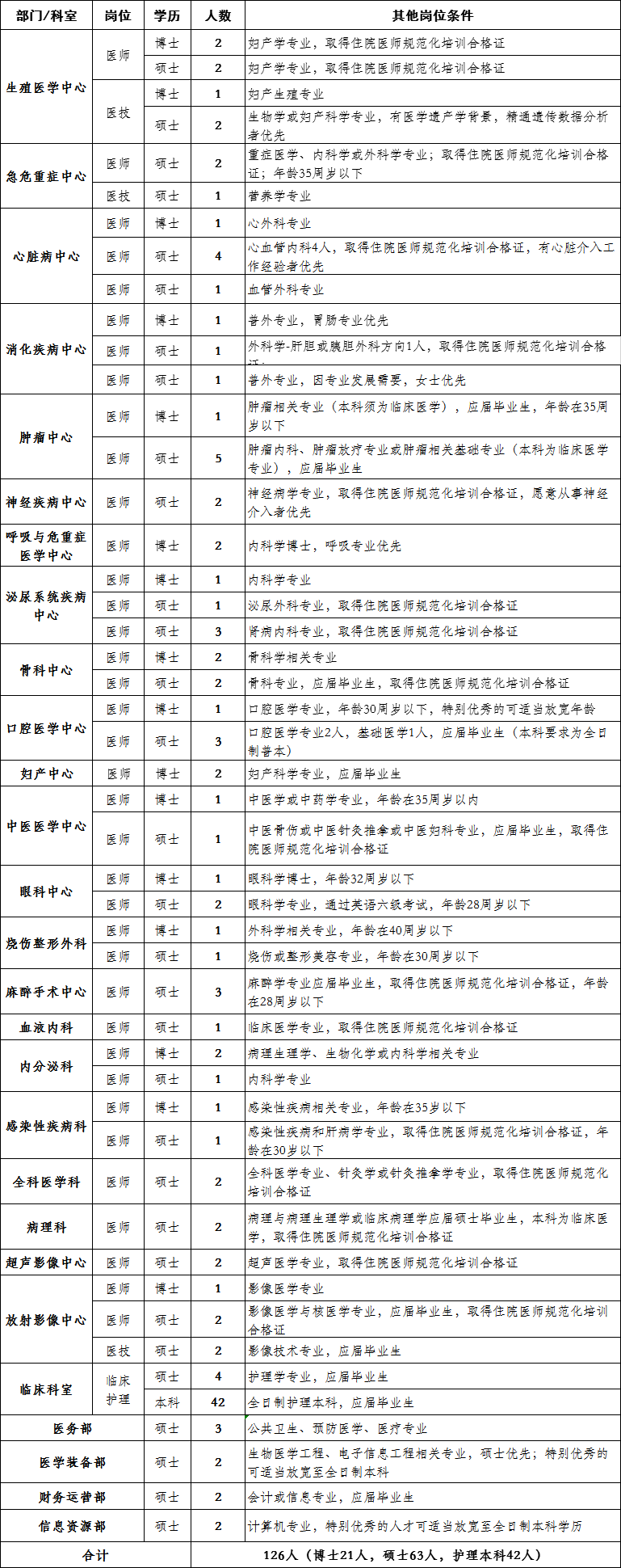 招聘崗位:高層次博士研究生21人,碩士研究生63人,優(yōu)秀護理全日制本科應屆畢業(yè)生42人,具體崗位及條件見下表: