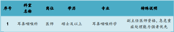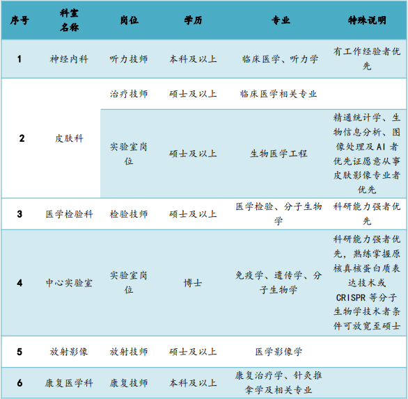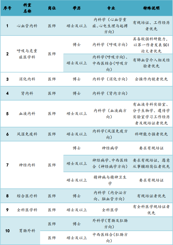 (3)優(yōu)先錄用博士、具備三甲醫(yī)院相關(guān)工作經(jīng)歷者,臨床8年制博士可不受專(zhuān)業(yè)限制,應(yīng)聘各科室;