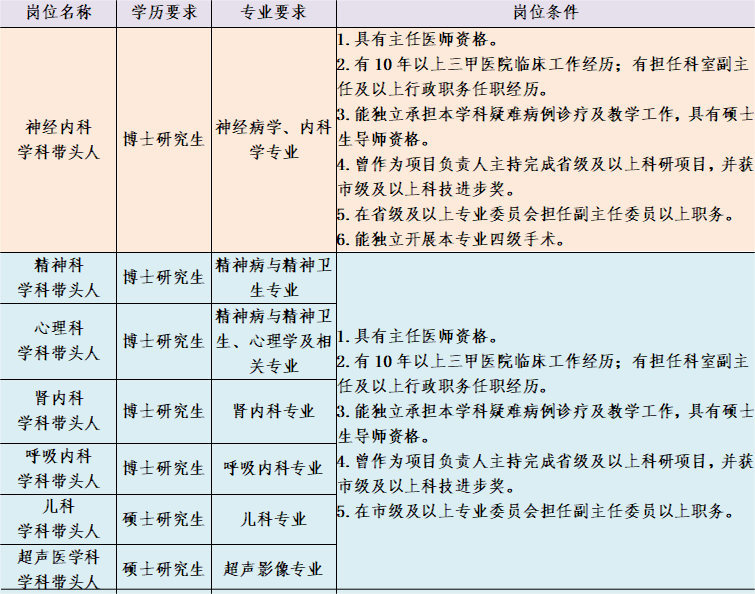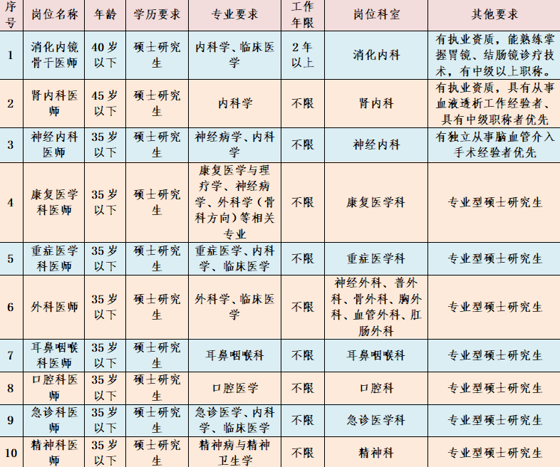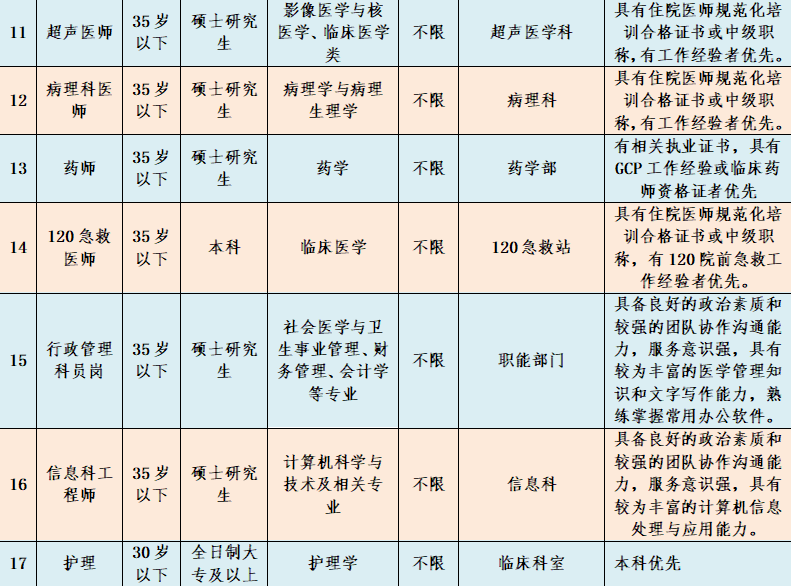 3、醫(yī)療專業(yè):起點(diǎn)學(xué)歷均要求為全日制統(tǒng)招本科,不含“中起本”、“專套本”、“專升本”、成教、電大、自考學(xué)歷及參加中職、高職對口高考畢業(yè)生。護(hù)理專業(yè):全日制大專及以上學(xué)歷,本科優(yōu)先。