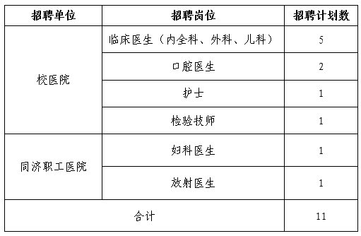 非應屆人員應為統(tǒng)招本科及以上學歷,具有醫(yī)師資格證書,中級及以上專業(yè)技術職稱。中級職稱者不超過40周歲(1983年4月1日之后出生),高級職稱者不超過45周歲(1978年4月1日之后出生)。校醫(yī)院醫(yī)生應聘人員需4年以上三級醫(yī)院工作經歷。同濟職工醫(yī)院有二級以上綜合性醫(yī)院5年工作經驗者優(yōu)先。