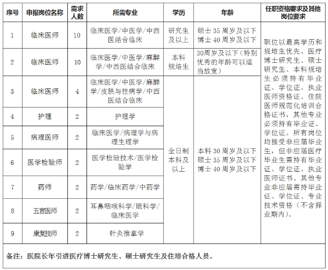 為了滿足醫(yī)院臨床業(yè)發(fā)展需求,保證醫(yī)院人力資源合理配置,結(jié)合醫(yī)院“一院三區(qū)”發(fā)展戰(zhàn)略及醫(yī)院人才合理配置,現(xiàn)面向社會公開招聘工作人員,具體招聘崗位如下: