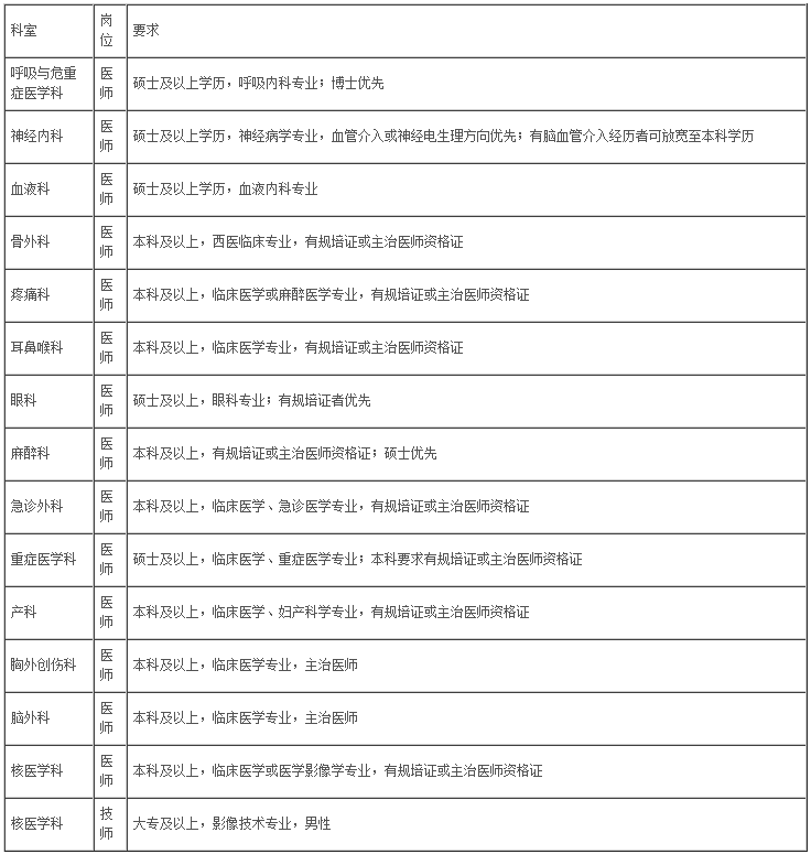 (2)各崗位起點(diǎn)學(xué)歷要求為全日制統(tǒng)招學(xué)歷,具備三級(jí)醫(yī)院相關(guān)工作經(jīng)歷、有執(zhí)業(yè)醫(yī)師資格、住院醫(yī)師規(guī)范化培訓(xùn)合格者優(yōu)先考慮;臨床8年制博士,可不受專業(yè)限制,應(yīng)聘各科室;