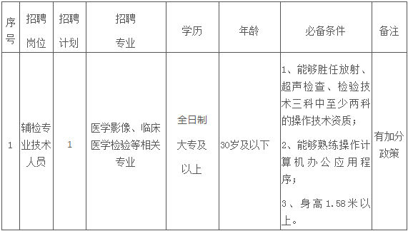 為滿足我院臨床及公共衛(wèi)生業(yè)務(wù)需求,根據(jù)單位人事管理相關(guān)規(guī)定,我院擬面向社會公開招聘輔檢專業(yè)技術(shù)人員1名。現(xiàn)將有關(guān)事項公告如下: