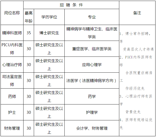有意者請(qǐng)將個(gè)人簡歷、1寸登記照、身份證、學(xué)歷學(xué)位證、資格證及相關(guān)證書一并打包以附件形式發(fā)送至郵箱3213563217@qq.com,郵件標(biāo)題注明:“崗位名稱+姓名”,如:精神科醫(yī)師+姓名。