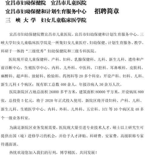 以上就是小編為大家整理的湖北宜昌市婦幼保健院招聘醫(yī)師25人,請大家多多關(guān)注醫(yī)學(xué)教育網(wǎng),我們會隨時更新更多更好的關(guān)于醫(yī)學(xué)知識、醫(yī)療招聘及考試輔導(dǎo)等相關(guān)內(nèi)容,敬請期待!
