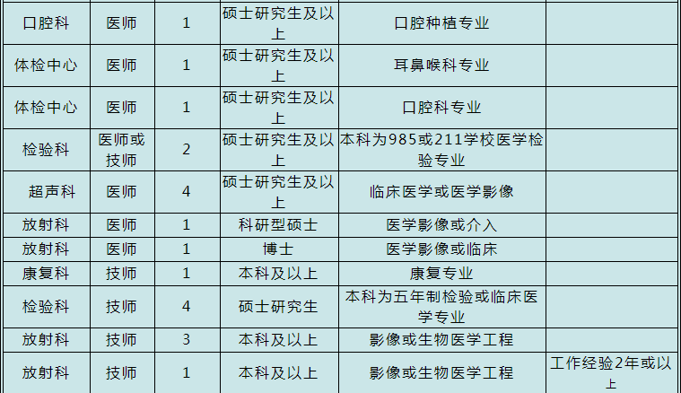 臨床醫(yī)師要求碩士研究生及以上,四證合一者優(yōu)先錄用,基礎(chǔ)學(xué)歷要求為全日制統(tǒng)招本科,不含“中起本”、“專套本”、“專升本”、成教、電大、自考學(xué)歷及參加中職、高職對口高考畢業(yè)生;同時,應(yīng)屆畢業(yè)生一般應(yīng)在2020年7月31日前取得各階段的學(xué)歷和學(xué)位證書,往屆畢業(yè)生須審核各階段已取得學(xué)歷和資格證書。
