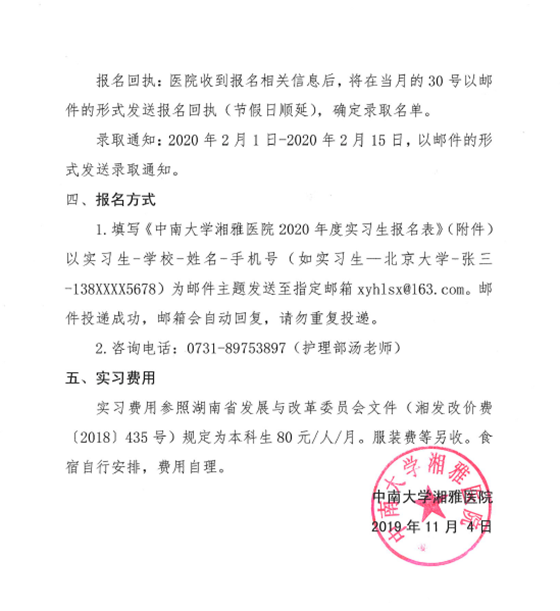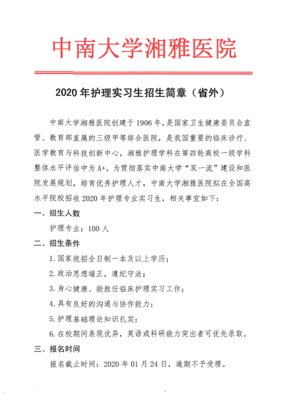 關(guān)于湖南省中南大學(xué)湘雅醫(yī)院2020年護(hù)理實(shí)習(xí)生的招生簡(jiǎn)章!具體內(nèi)容如下,希望能夠幫助到您!