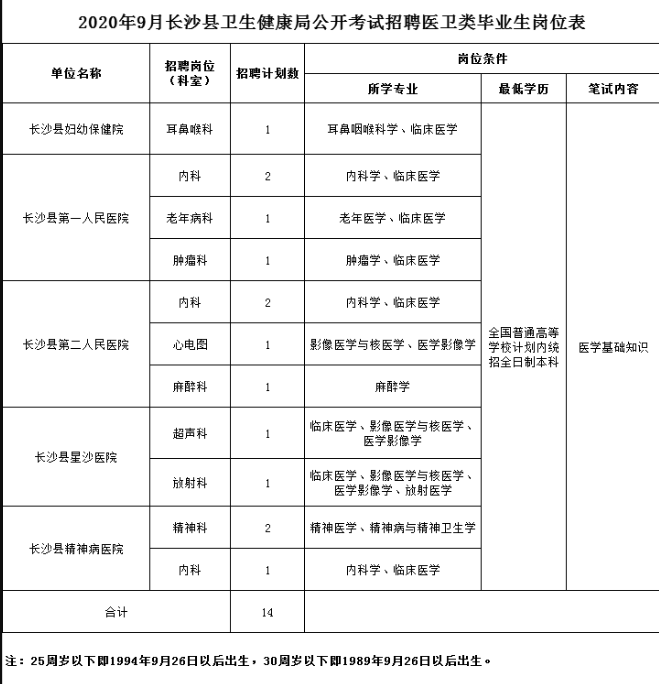 以上就是“湖南長沙縣人社局和衛(wèi)健局2020年9月份公開考試招聘醫(yī)療崗崗位計劃及要求(14人)”的通知內容。