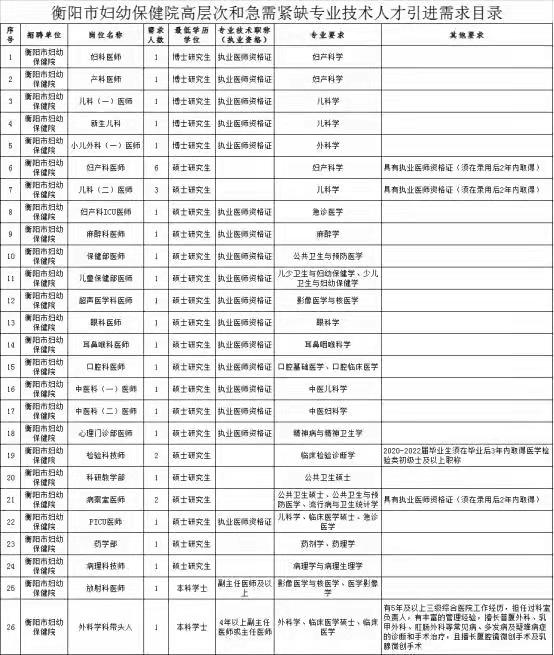衡陽市婦幼保健院引進人才資格條件及政策待遇嚴格按照《衡陽市關于發(fā)布2022年度高層次和急需緊缺專業(yè)技術人才引進需求目錄的公告》()執(zhí)行。