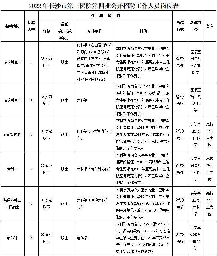 長沙市第三醫(yī)院2022年第四批招聘工作人員18名
