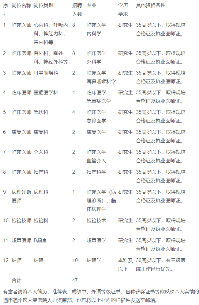 有意者請(qǐng)將本人簡(jiǎn)歷、推薦表、成績(jī)單、外語(yǔ)等級(jí)證書、各種獲獎(jiǎng)證書等能反映本人實(shí)績(jī)的材料復(fù)印送達(dá)或寄送至南通市通州區(qū)人民醫(yī)院人力資源部,也可將以上材料的掃描件發(fā)送至郵箱。