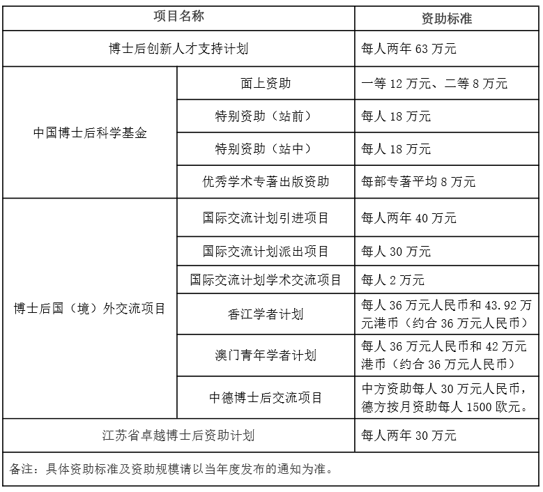 3、醫(yī)院鼓勵(lì)、支持博士后申報(bào)國(guó)家和江蘇省的各類(lèi)博士后人才項(xiàng)目和研究項(xiàng)目(詳見(jiàn)下表)。所獲得的資助補(bǔ)貼不計(jì)入總薪酬,疊加發(fā)放。