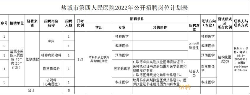 )、鹽城市衛(wèi)生健康委員會網(wǎng)()及單位網(wǎng)站上發(fā)布,具體的招聘單位、招聘崗位、數(shù)量、資格條件等詳見《鹽城市第四人民醫(yī)院2022年公開招聘崗位計(jì)劃表》(以下簡稱《招聘崗位表》)。