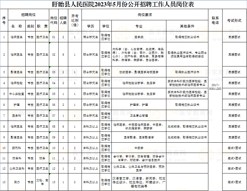 本次共計(jì)劃招聘工作人員30人,招聘崗位、人數(shù)和相關(guān)要求詳見(jiàn)《盱眙縣人民醫(yī)院2023年5月份公開(kāi)招聘工作人員崗位表》(附件1)。
