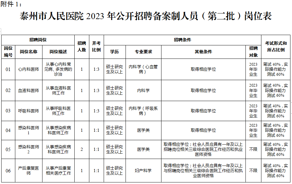本次面向社會公開招聘備案制人員14人,招聘崗位、人數和相關要求詳見《泰州市人民醫(yī)院2023年公開招聘備案制人員(第二批)崗位表》(附件1,以下簡稱《崗位表》)。