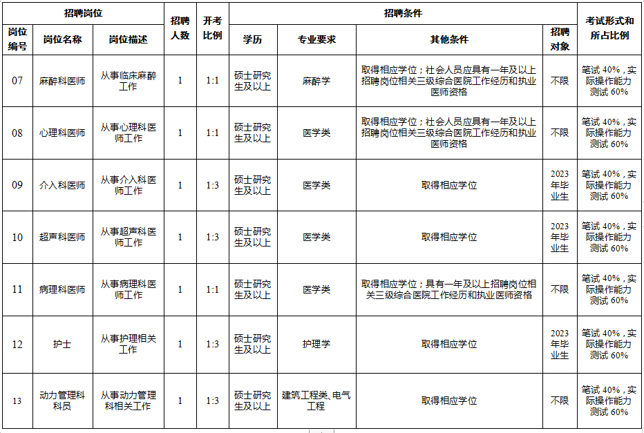 6.“2023年畢業(yè)生”,指將在2023年畢業(yè)并取得學歷(學位)證書,且尚無工作單位的人員。2021年和2022年普通高校畢業(yè)生,若已取得學歷、學位證書且從未落實工作單位,其檔案關系仍保留在原畢業(yè)學校,或保留在各級畢業(yè)生就業(yè)主管部門(畢業(yè)生就業(yè)指導服務中心)、人才交流服務機構和公共就業(yè)服務機構的,以及國(境)外同期畢業(yè)且已完成學歷認證但仍未落實工作單位的人員,可應聘面向2023年畢業(yè)生崗位。其他非2023年畢業(yè)生除符合招聘崗位所需資格要求外,應具有一年以上與招聘崗位相關三級綜合醫(yī)院工作經歷(醫(yī)護類崗位)。(年限計算截止日期以招聘報名截止日期為準,在校就讀期間的社會實踐經歷,不能視為工作經歷)。