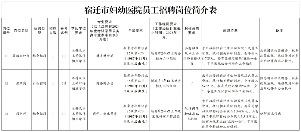 招聘人員性質(zhì)為宿遷市婦幼醫(yī)院正式員工,執(zhí)行宿遷市婦幼醫(yī)院薪酬體系標準,按有關(guān)規(guī)定繳納“五險一金”,享受醫(yī)院伙食補助和工會福利。