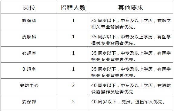 靖江市人民醫(yī)院擬向社會公開招聘臨時工11名,從事影像科窗口登記、心超室書記員、B超室書記員、皮膚科治療師、消控室消防主機操作、安保等工作(委托江蘇雅康物業(yè)管理有限公司管理,按國家規(guī)定繳納保險)。