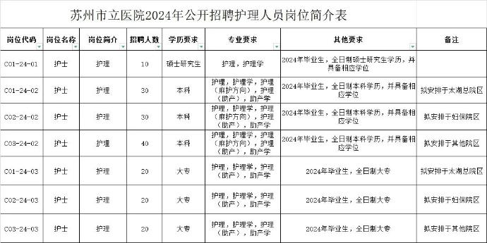 本次招聘需求為7個崗位,共170人。具體崗位名稱、招聘人數(shù)及各個招聘崗位的條件詳見下面《蘇州市立醫(yī)院2024年公開招聘護理人員崗位簡介表》。