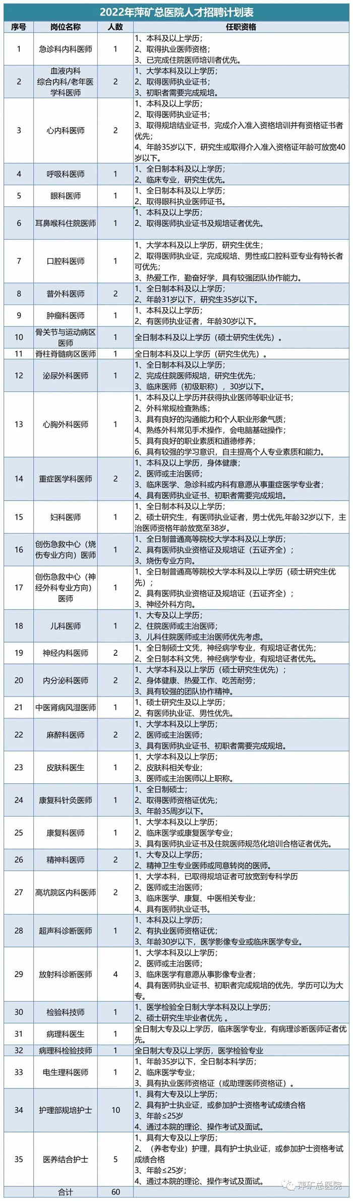 江西省萍鄉(xiāng)市萍礦總醫(yī)院2022年招聘人才60名