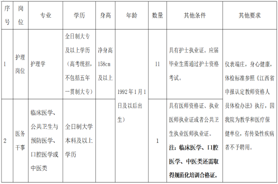 很多即將步入醫(yī)療崗位的朋友們都非常關(guān)注所在地區(qū)醫(yī)療崗位的招聘公告信息,醫(yī)學(xué)教育網(wǎng)醫(yī)療衛(wèi)生招聘欄目為了更好的服務(wù)正在找工作的醫(yī)療相關(guān)專業(yè)人員,每天為大家整理搜集新鮮的各地醫(yī)療衛(wèi)生系統(tǒng)/醫(yī)院等招聘公告通知和信息,歡迎大家查看!以下是公告通知:九江學(xué)院附屬口腔醫(yī)院招聘護(hù)士11名、醫(yī)務(wù)干事1名,內(nèi)容如下: