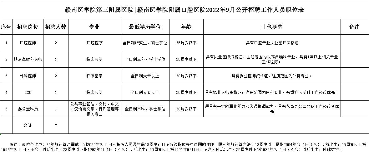 具體詳見《贛南醫(yī)學(xué)院第三附屬醫(yī)院|贛南醫(yī)學(xué)院附屬口腔醫(yī)院2022年9月公開招聘工作人員職位表》。