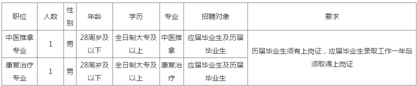 因醫(yī)院發(fā)展需要,我院現(xiàn)面向社會公開招聘聘用制中醫(yī)推拿專業(yè)、康復(fù)治療學(xué)專業(yè)各一名。