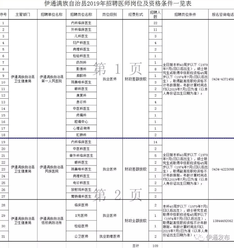 本次招聘計劃為109人(具體見附件《伊通滿族自治縣2019年招聘醫(yī)師崗位及資格條件一覽表》)。