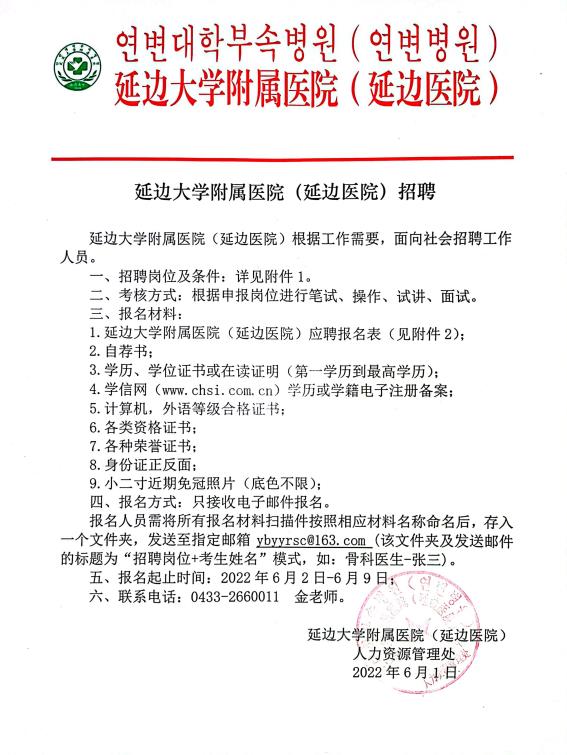 很多即將步入醫(yī)療崗位的朋友們都非常關(guān)注所在地區(qū)醫(yī)療崗位的招聘公告信息,醫(yī)學(xué)教育網(wǎng)醫(yī)療衛(wèi)生招聘欄目為了更好的服務(wù)正在找工作的醫(yī)療相關(guān)專業(yè)人員,每天為大家整理搜集新鮮的各地醫(yī)療衛(wèi)生系統(tǒng)/醫(yī)院等招聘公告通知和信息,歡迎大家查看!以下是公告通知:吉林省延邊大學(xué)附屬醫(yī)院(延邊醫(yī)院)2022年招聘工作人員14人,內(nèi)容如下: