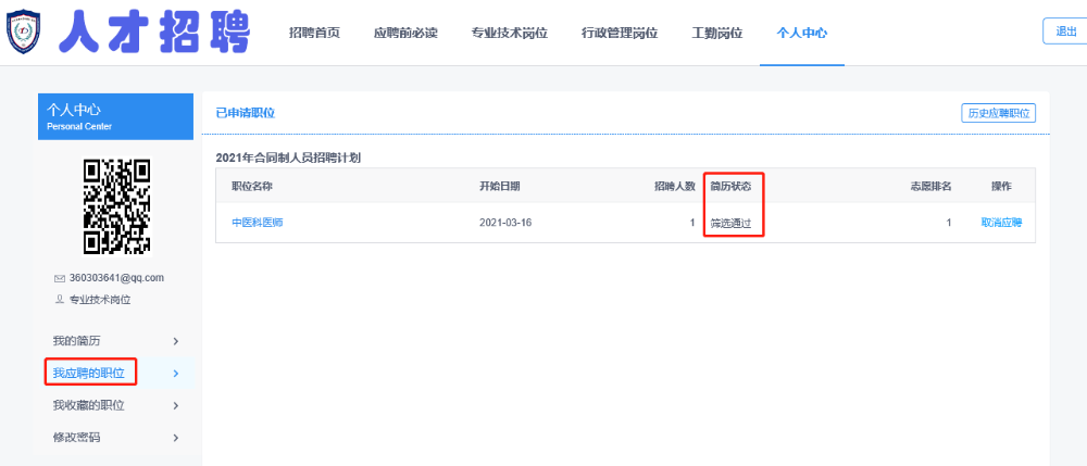 報名參加我院2022年合同制人員招聘第一批、第二批的考生,請登錄報名網(wǎng)站所登記的個人賬號,點擊左側(cè)“我應(yīng)聘的職位”,其中簡歷狀態(tài)顯示為“待筆試”的即為報名成功,資格審查初審?fù)ㄟ^。