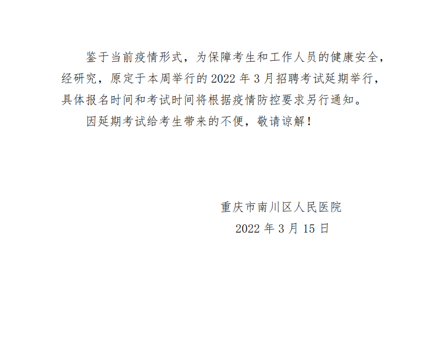 重慶市南川區(qū)人民醫(yī)院關于延期舉行2022年3月招聘考試的通知