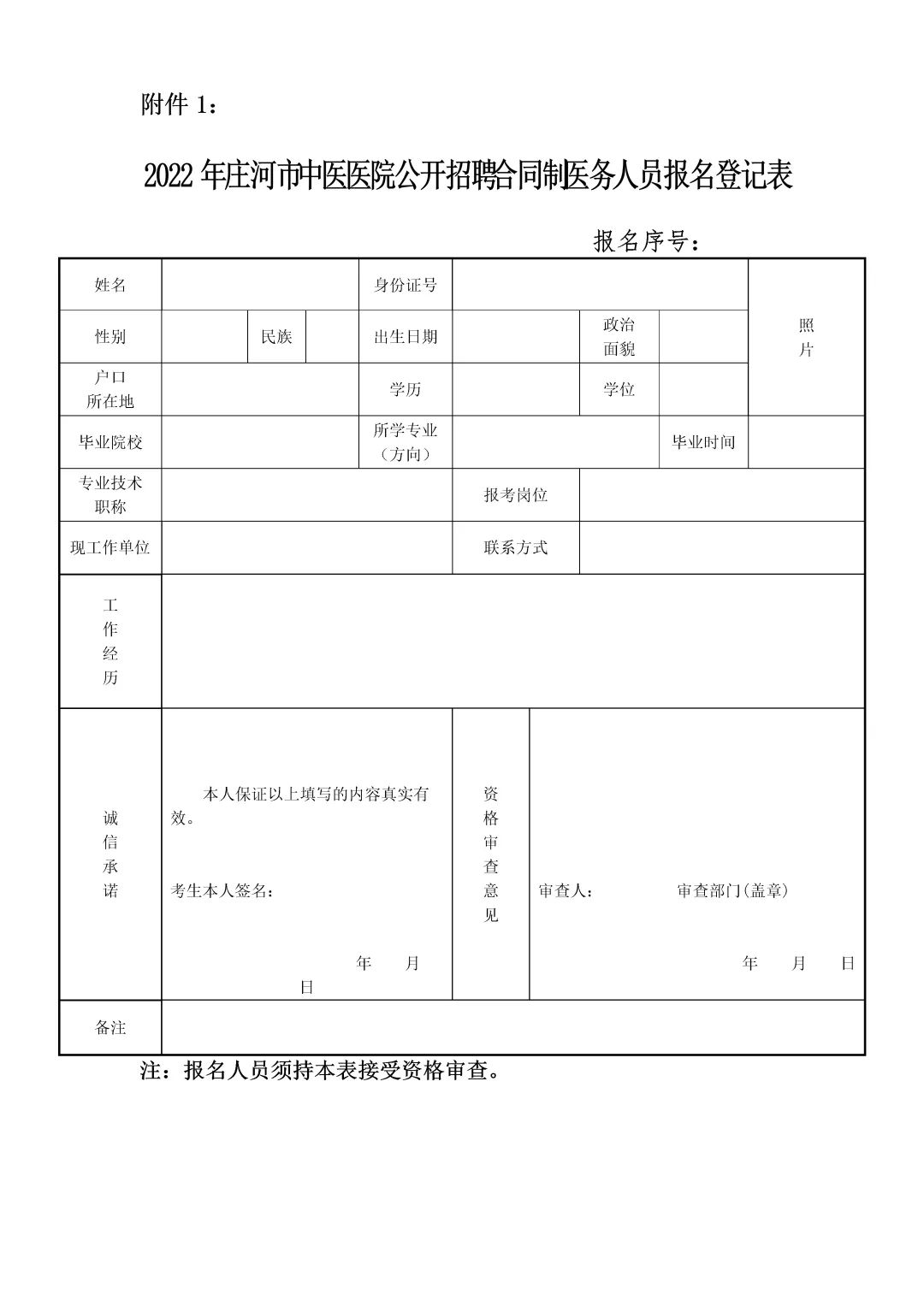2.現(xiàn)場報名。應(yīng)聘人員須持《報名登記表》、居民身份證原件及復(fù)印件、畢業(yè)證原件及復(fù)印件(2022屆除外)、學(xué)位證原件及復(fù)印件(2022屆除外)、學(xué)信網(wǎng)學(xué)籍在線驗證報告、研究生學(xué)歷須持有醫(yī)師資格證書原件及復(fù)印件、近期2寸免冠照片2張,到莊河市中醫(yī)醫(yī)院人事科報名(門診五樓),報名費50元/人?,F(xiàn)場報名必須本人到場,他人代替報名無效。