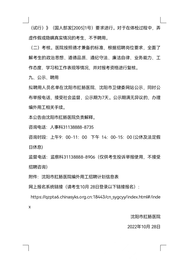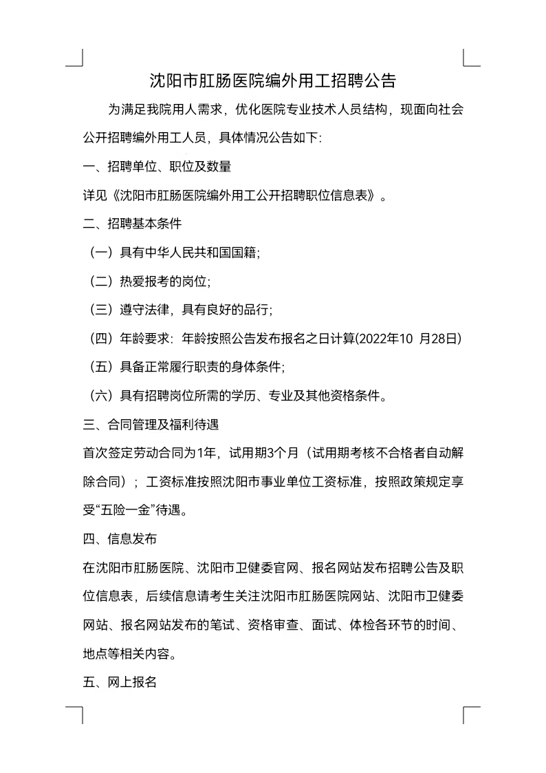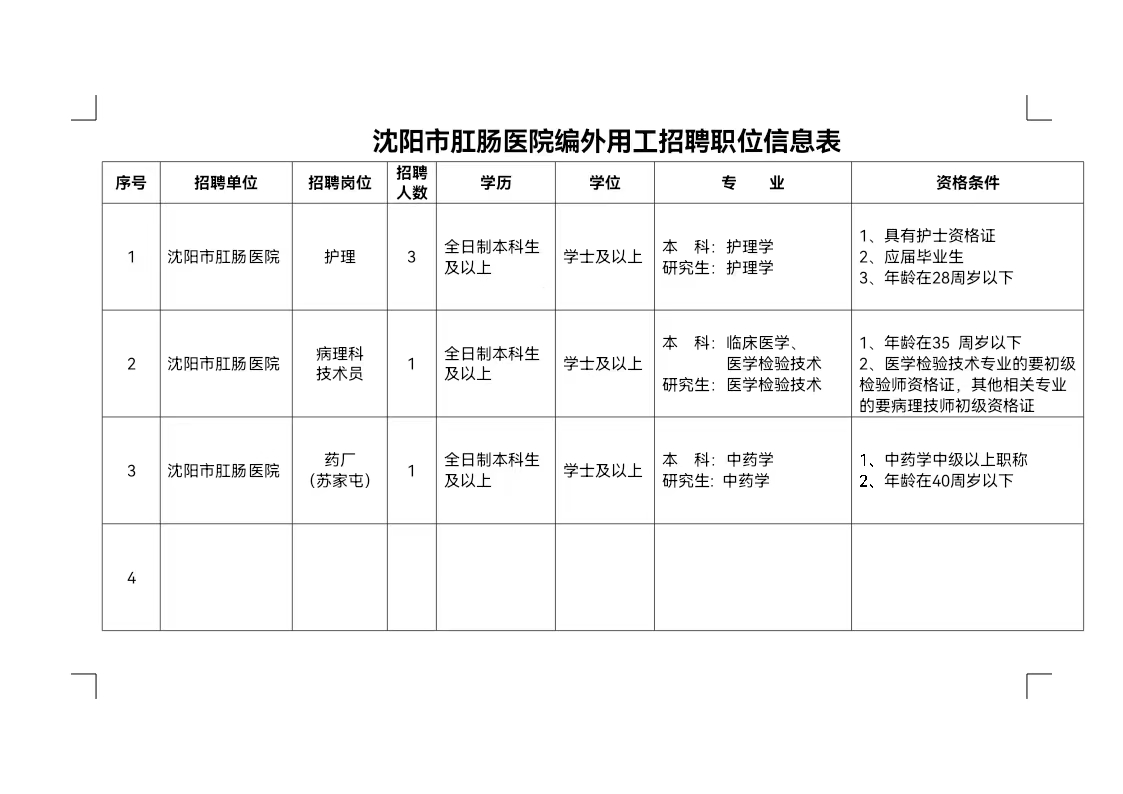 遼寧省沈陽(yáng)市肛腸醫(yī)院2022年招聘編外用工人員5人