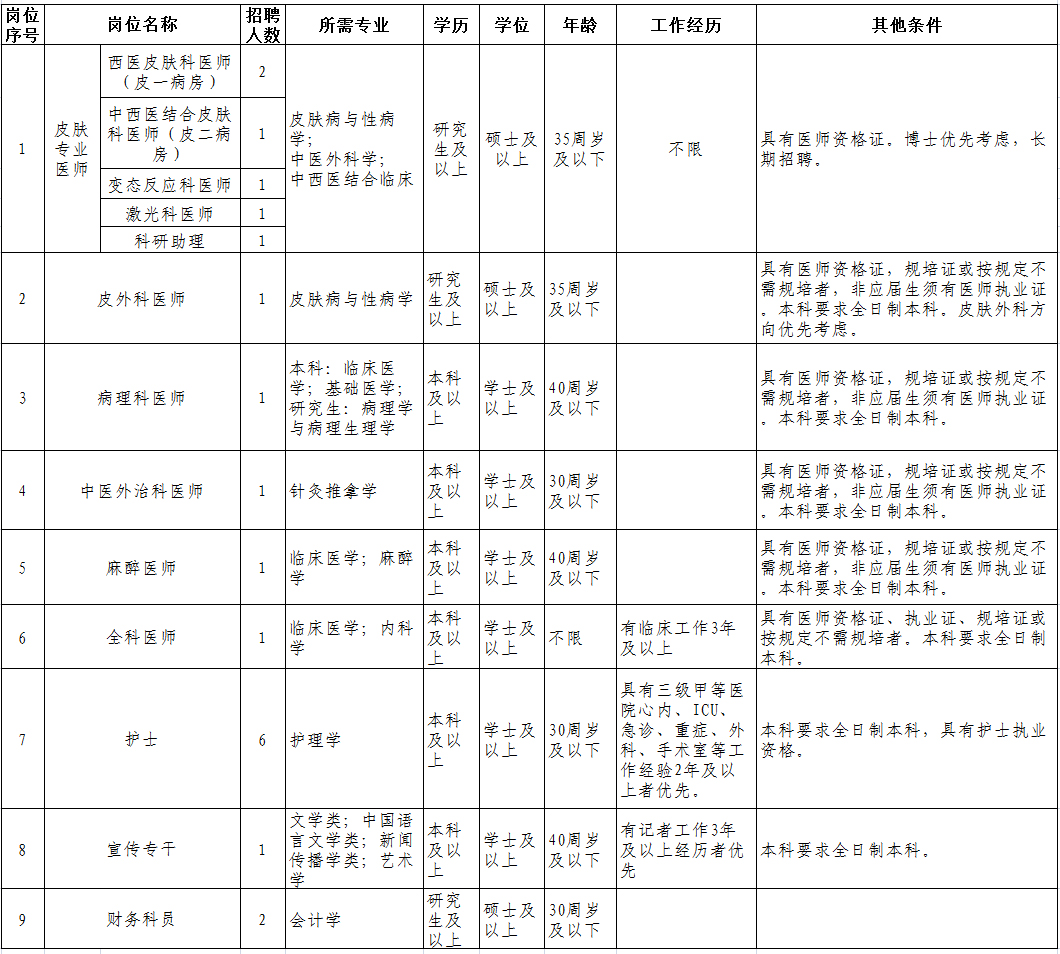 醫(yī)院本次面向社會(huì)公開(kāi)招聘合同制工作人員,共計(jì)招聘皮膚病專(zhuān)業(yè)、皮膚外科、病理科、中醫(yī)外治科、麻醉醫(yī)師、全科(內(nèi)科)醫(yī)師、護(hù)士、宣傳、財(cái)務(wù)人員20人,具體情況如下:(見(jiàn)表格)