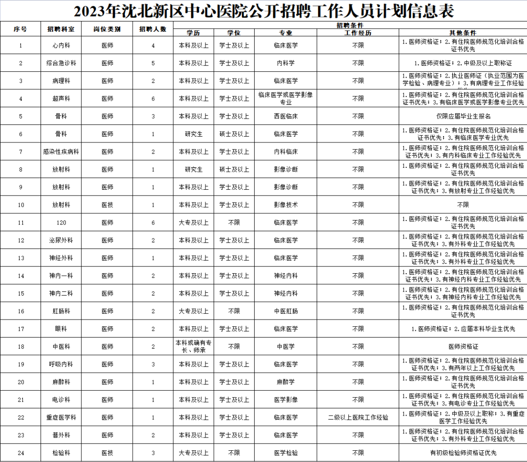附件:2023年沈北新區(qū)中心醫(yī)院公開招聘工作人員計劃信息表