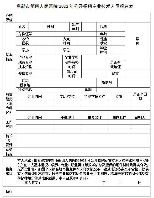 附件:阜新市第四人民醫(yī)院2023年公開招聘專業(yè)技術人員報名表。doc