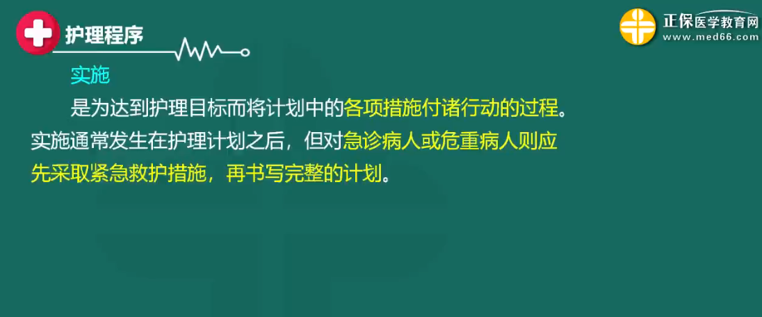 實(shí)施是為達(dá)到護(hù)理目標(biāo)而將計(jì)劃中的各項(xiàng)措施付諸行動(dòng)的過(guò)程。實(shí)施通常發(fā)生在護(hù)理計(jì)劃之后,但對(duì)急診病人或危重病人則應(yīng)先采取緊急救護(hù)措施,再書(shū)寫(xiě)完整的計(jì)劃。