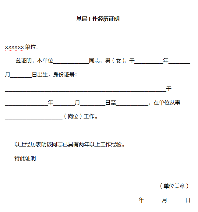 基層工作經(jīng)歷證明